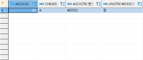 SELECT ASCII('A'), CHR(65), ASCIISTR('한'), UNISTR('\D55C') FROM DUAL;