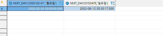 SELECT NEXT_DAY('2020-02-01', '월요일'), NEXT_DAY(SYSDATE, '일요일') FROM DUAL;