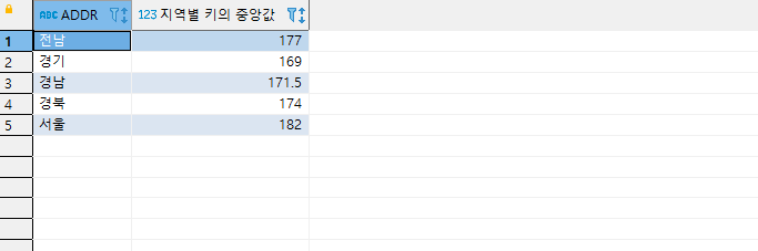 SELECT addr, userName, height AS "키", (CUME_DIST() OVER (PARTITION BY addr ORDER BY height DESC)) * 100 AS "누적인원 백분율%" FROM userTbl ; - PERCENTILE_CONT() 각 지역별 키의 중앙값 계산