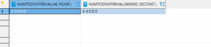 SELECT NUMTODSINTERVAL(48, 'HOUR'), NUMTODSINTERVAL(360000, 'SECOND') FROM DUAL;