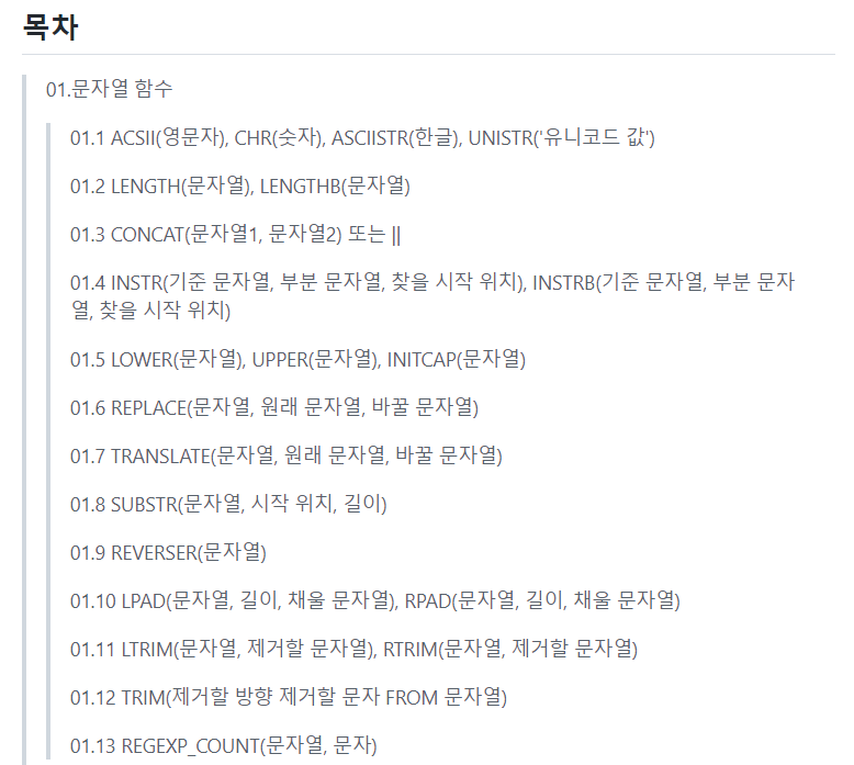01.1 ACSII(영문자), CHR(숫자), ASCIISTR(한글), UNISTR('유니코드 값')