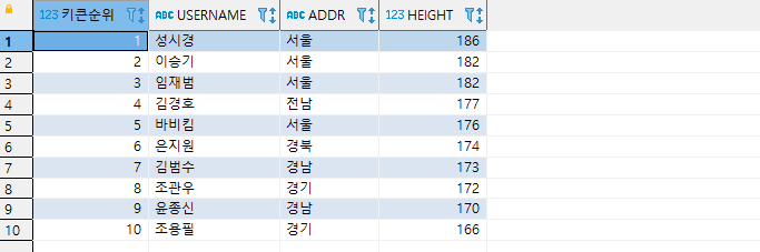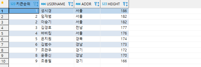 -- 키가 동일하다면 이름순 순위 SELECT ROW_NUMBER( ) OVER(ORDER BY height DESC, userName ASC) "키큰순위", userName, addr, height FROM userTbl ; -