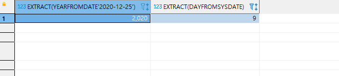 SELECT EXTRACT(YEAR FROM DATE '2020-12-25'), EXTRACT(DAY FROM SYSDATE) FROM DUAL;