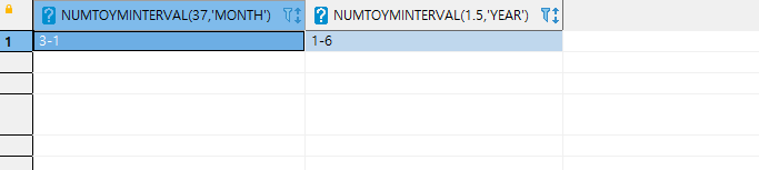 SELECT NUMTOYMINTERVAL(37, 'MONTH'), NUMTOYMINTERVAL(1.5, 'YEAR') FROM DUAL;