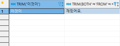 SELECT TRIM(' 이것이 '), TRIM(BOTH 'ㅋ' FROM 'ㅋㅋㅋ재밌어요.ㅋㅋㅋ') FROM DUAL;