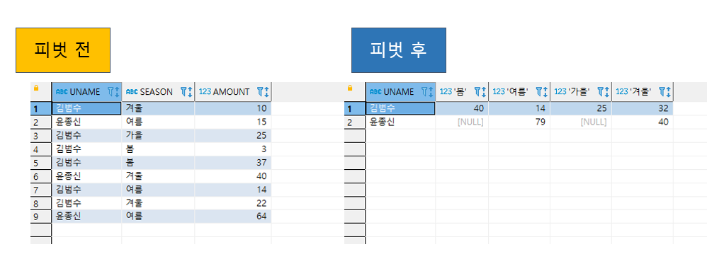 INSERT INTO pivotTest VALUES ('윤종신' , '겨울', 40) ;