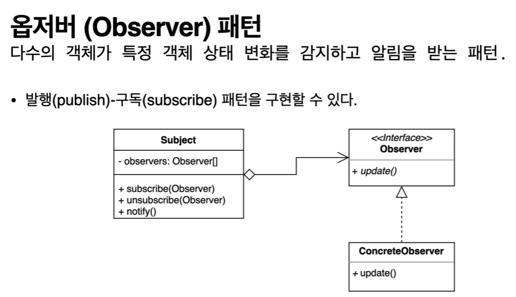 - 여러개의 객체들이 보통 어떤 상태를 감지하고 반응할때 사용