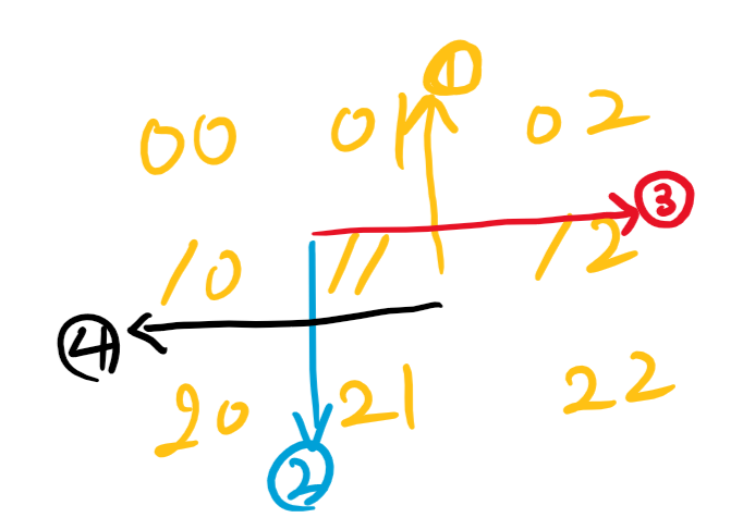1 번방은 위로 가는 것이니 11에 위치한다면 01로가는 것이니, -1,0