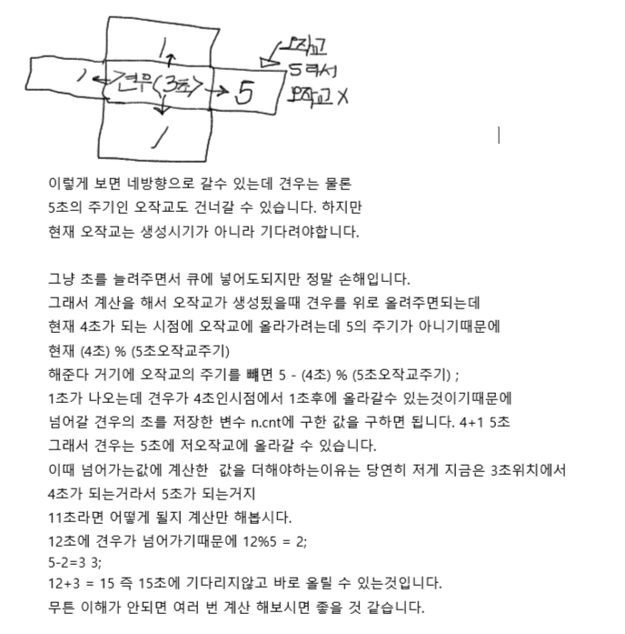 3 번오작교에 도달했을때 오작교생성 시간 계산해서 큐에 넣어주기만 하면 됩니다.